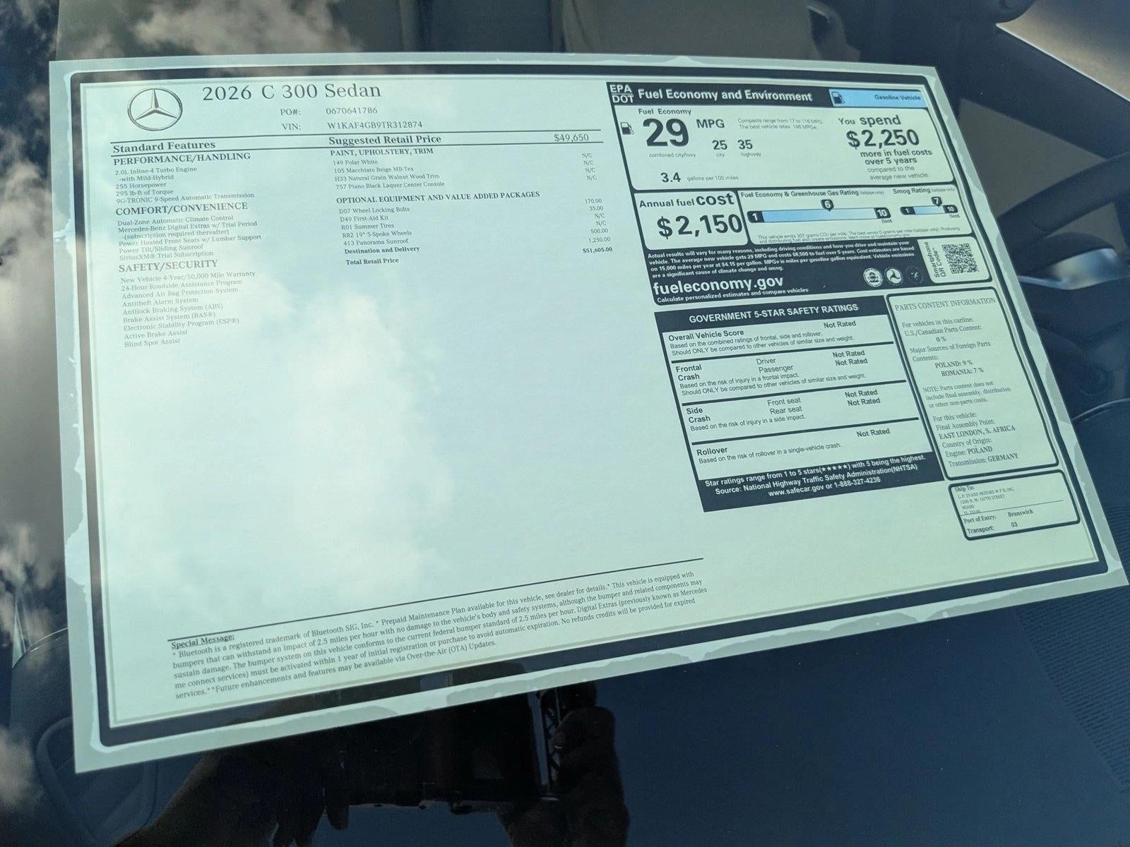 Mercedes-Benz of Miami is pleased to be currently offering this 2026 Mercedes-Benz C-Class C 300 with 1,778mi. This Mercedes-Benz includes: WHEELS: 7.5J Tires - Front Performance Aluminum Wheels Tires - Rear Performance PIANO BLACK LACQUER CENTER CONSOLE WHEEL LOCKING BOLTS (PIO) Wheel Locks PANORAMA SUNROOF Panoramic Roof Generic Sun/Moonroof Sun/Moonroof Dual Moonroof BLACK FABRIC HEADLINER POLAR WHITE NATURAL GRAIN WALNUT WOOD TRIM Woodgrain Interior Trim *Note - For third party subscriptions or services, please contact the dealer for more information.* Is it possible to fall in love with a vehicle? It is when your vehicle is as prestige as the Mercedes-Benz C-Class. If you are looking for a vehicle with great styling, options and incredible fuel economy, look no further than this quality automobile. Feel at ease with your purchase of this Mercedes-Benz C-Class C 300, The service records are included allowing you to truly know what you're buying.